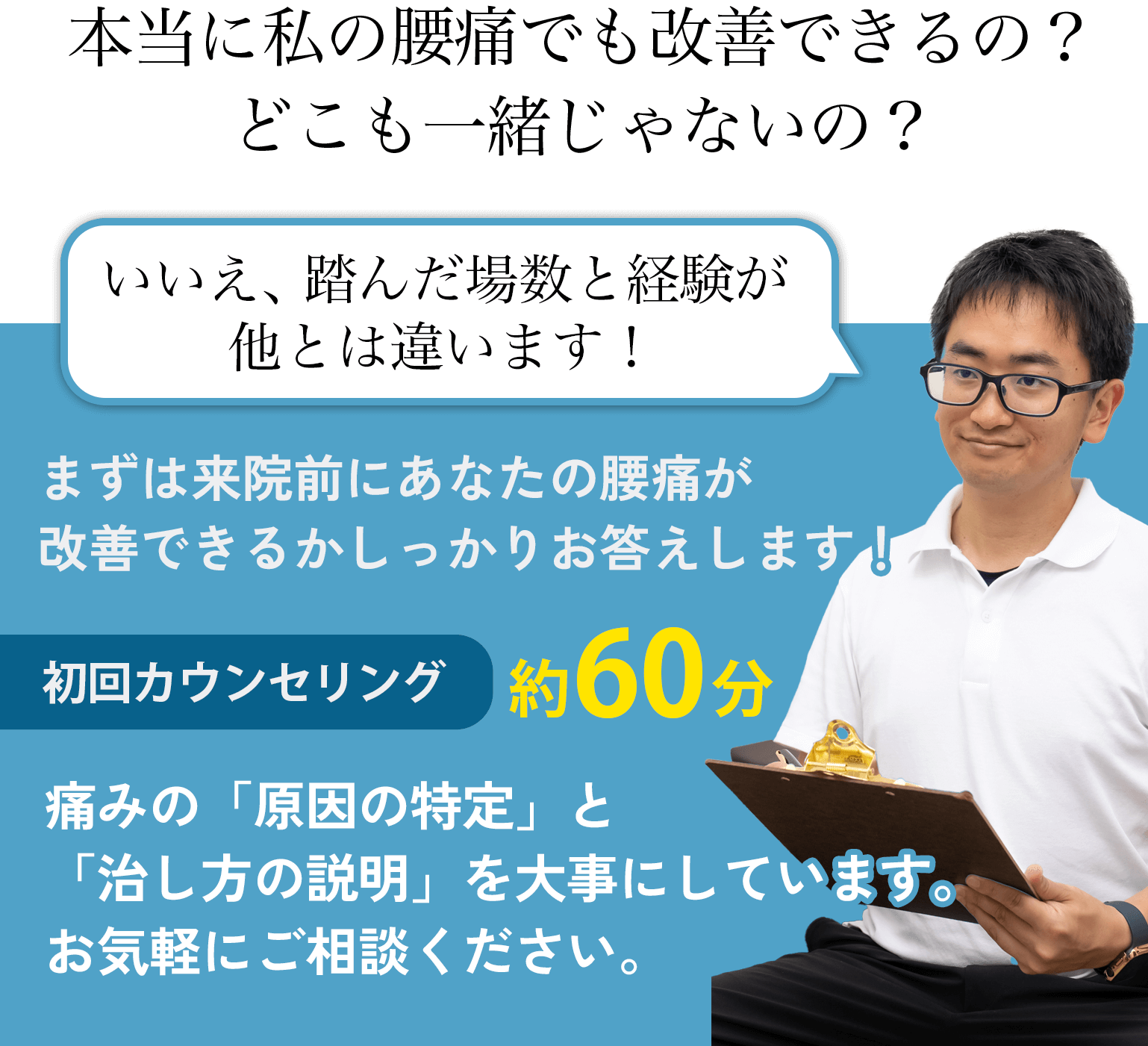 体の状態を確認し、なぜ腰に負担がかかっているのかを見極め、その方に合った施術を行うためには一定の時間と技術が必要です。