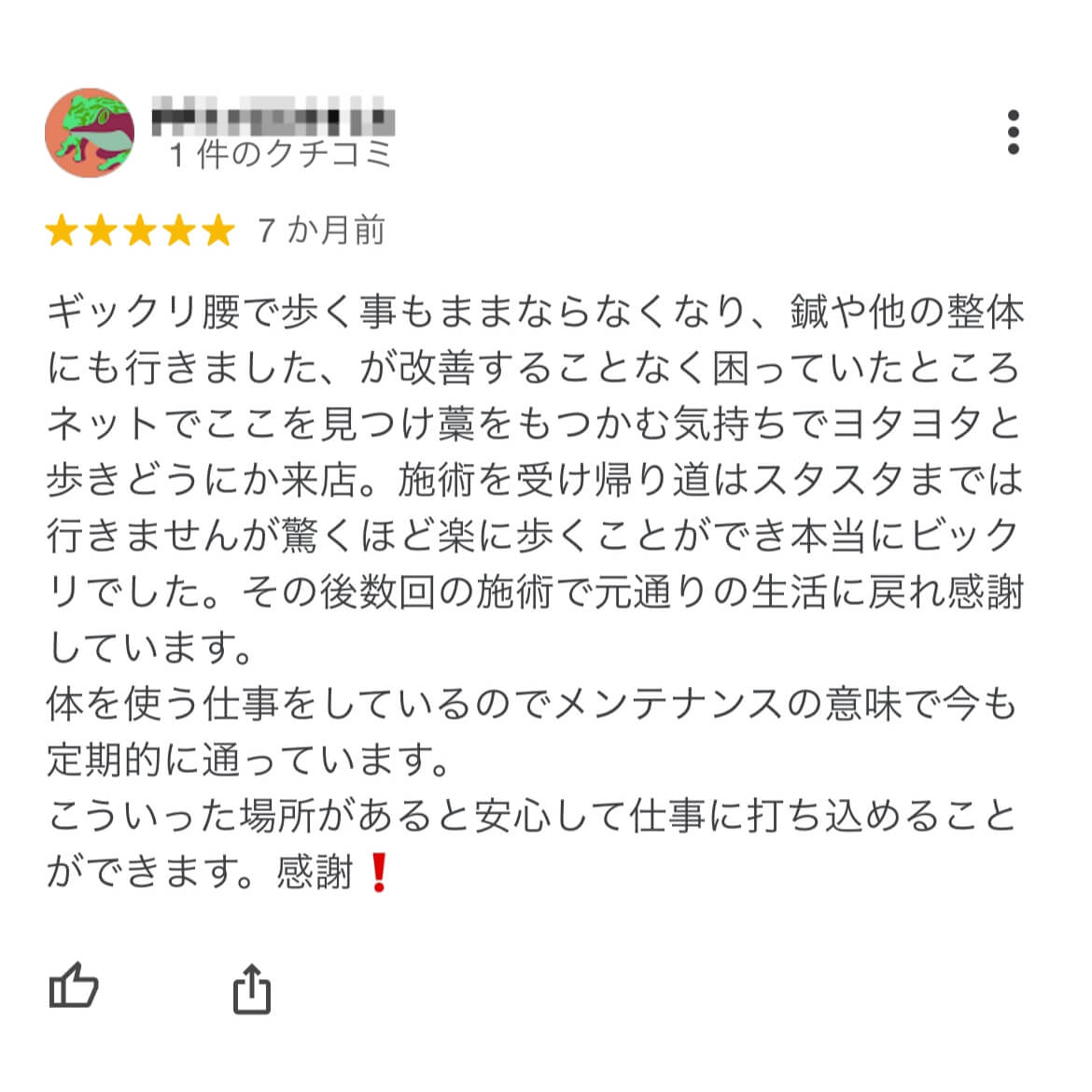 | 来院前のお悩み(Before) | 朝~夜まで持続痛。各所を受診するも一時的な痛み改善しかできていなかった。ぎっくり腰時はLINEで緊急相談を受けました。 |