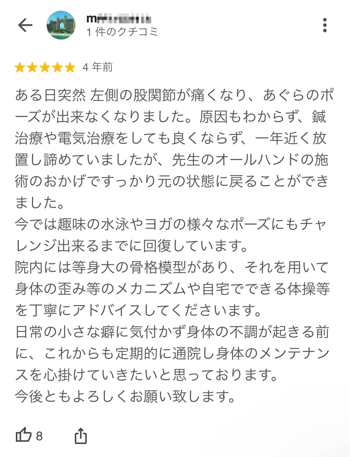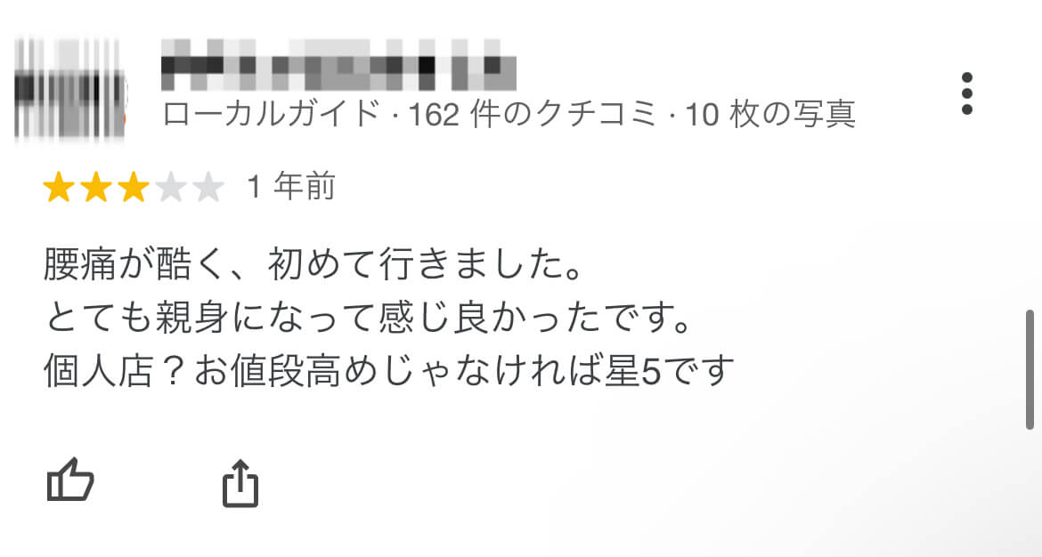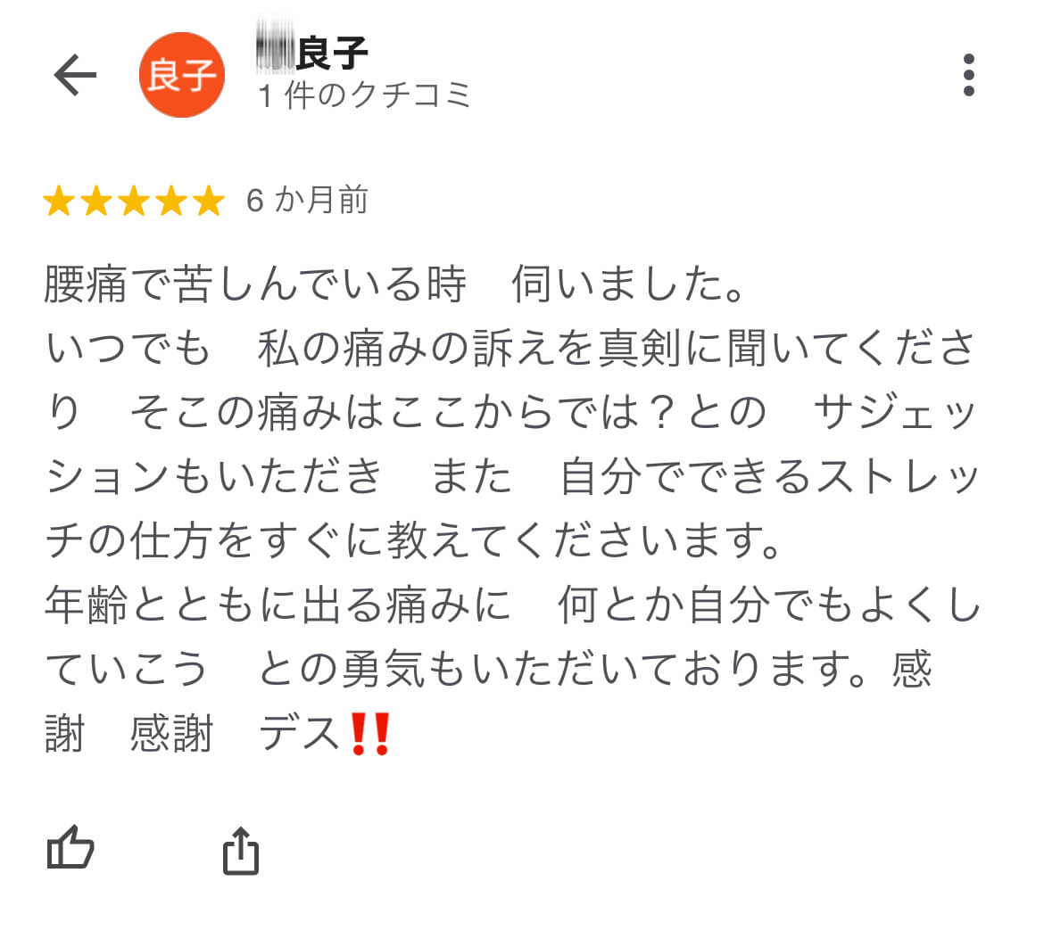 | 本人のコメント | 数回で完全に痛みがなくなりました。腕は確かですね! |